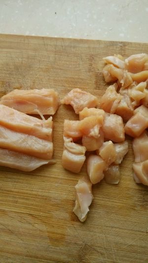 鸡胸肉切丁,加糖、盐、酱油腌制10分钟,青红椒及算切碎备用