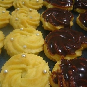 柠檬曲奇:将糖粉加入少量柠檬汁搅拌成稀糊状。刷在曲奇上,最后装饰上小银珠糖。
