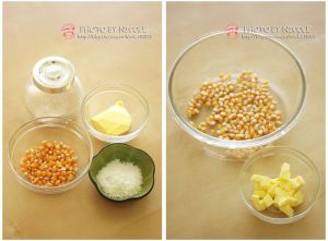 黄油切成小粒,放在玻璃碗中,小玉米粒吹去浮尘,放入一个微波可用的带盖大容器中(盖子上要有气孔);