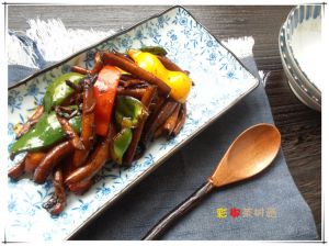 加入老抽、五香粉;入彩椒片炒入味,洒一点麻油即可。