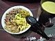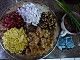 底下铺半碗蒸熟的玉米饭,上面在盖上汤汁香料。