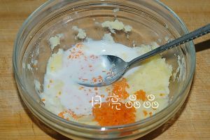 土豆撕去皮,用勺子按压成泥,叮熟的胡萝卜切成末加入土豆泥中,加少量盐和黑胡椒粉,边用勺子搅拌,边加入适量牛奶,调整到合适的稀稠度即可.