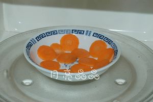 胡萝卜切片,放在盘子里,撒少量水,入微波炉叮一分钟左右至熟.