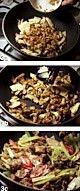 放锅回中大火上,加油1汤匙,搪匀锅面后加入肉丝,铺成一层,煎至转色后翻面, 再煎至全部转