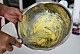 将鸡蛋打散,分三次加入到黄油和糖的混合物中。每次加入都得等鸡蛋和黄油充分搅拌后再加下一次。