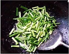 加入蒜苔辣椒放盐,花椒粉炒至断生。