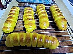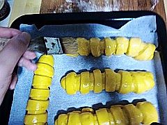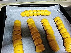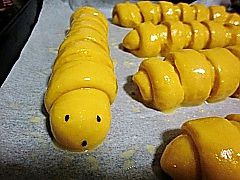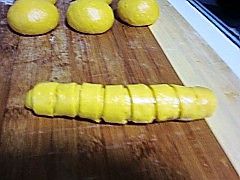 取一份擀开在一边划上几刀,要大小差不多相等,另一边放入肉松。