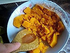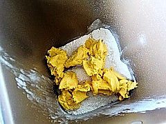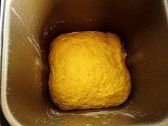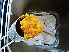 中种面团材料放入搅拌桶中加入南瓜泥搅拌成团。