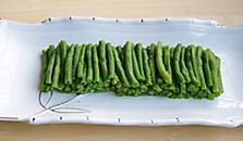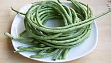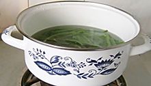 锅中放适量清水,烧开后放入豆角,以淹没豆角为好,待豆角变色后捞出,放入凉水中浸泡,反复两次,待豆角完全变凉后捞出