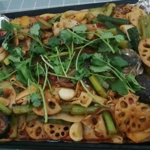 把配菜放入烤鱼盘,可以再放烤箱烤五分钟,也可以直接开吃。