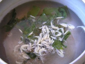锅内放水,烧开后放入石花菜、小虾米、云吞,待水再次烧开转小火煮3分钟左右,倒入打散的鸡蛋,加适量盐;