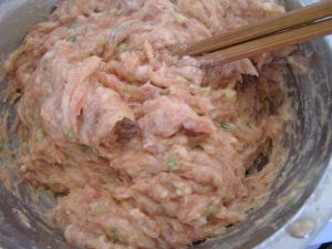 调馅:肉馅中加入生抽2茶匙、料酒1茶匙、蚝油1茶匙、鸡粉1/2茶匙、糖1/2茶匙、胡椒粉1/2茶匙、姜粉1茶匙、麻油1茶匙、盐适量延一个方向搅拌,边搅拌边分次加入水;