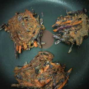 我没有吸油纸了,就拿了两片生菜叶凑合了一下,紫薯颜色太深,卖相不怎么样,但是紫薯胡萝卜丝炸熟很酥脆,外焦里嫩