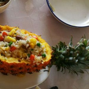 放蒸熟的米饭和菠萝翻炒匀,加少许胡椒粉