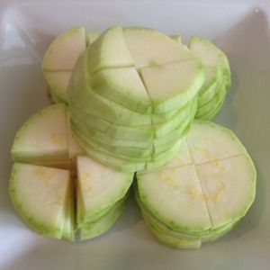 西葫芦用刮皮器,刮去外皮。再切成1厘米厚度的圆片。再把圆片5、6片垒起来,切成四刀成扇形备用。