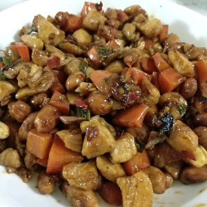 加入鸡肉丁和花生米(黄瓜也行),倒上欠汁,翻炒少许出锅即可。