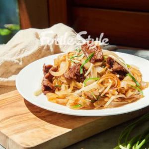 等河粉热透后,加入洋葱丝和芽菜,继续翻炒