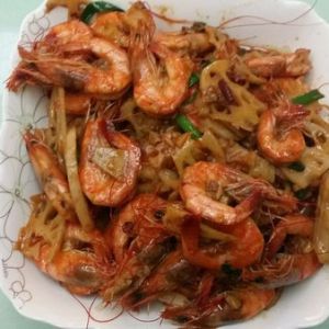 作料炒香后倒入鲜虾翻炒,变色后放入藕片