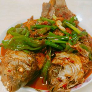 鱼和青椒捞出来装盘,撒上葱段,再淋上锅内的汁
