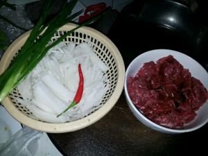 整理食材,牛肉切片,萝卜切细丝,葱切末,辣椒切末,牛肉加入少许味精,生抽,食用油,抓匀,再加入一点点地瓜粉抓一会儿(加入食用油和少许地瓜粉腌制可以让肉质更滑嫩,但地瓜粉一定要少,否则肉炒不出汤汁,不能更好的让萝卜入味)。