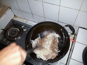 倒入萝卜丝,翻炒至萝卜出水变软,和牛肉充分混合。加入适量生抽调味。