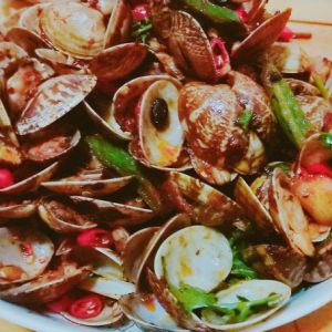 放入青红辣椒,花蛤翻炒几下,放入海鲜酱油,料酒
