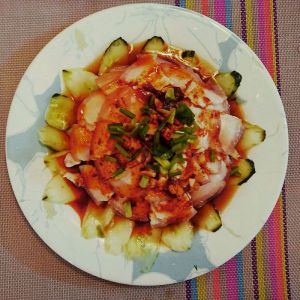 摆盘后,依次淋上姜蒜水、酱油、香醋、辣椒油~撒上葱花就可以啦!!!