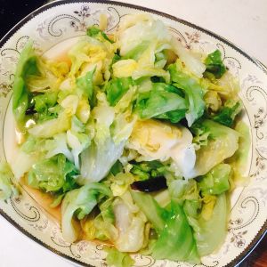 大火,包菜下锅,收干水份,菜蔫的时候加入一勺蒸鱼豉油;如果没有可用半勺生抽和半勺蚝油替代;适量油。