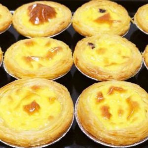 5.蛋挞皮摆好,底部放入几粒蔓越莓或葡萄干,加入九分满蛋挞液。