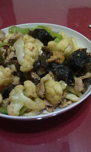 所有菜,包括花菜一起倒入,爆炒,少许盐和酱油,一分钟后即可关火。