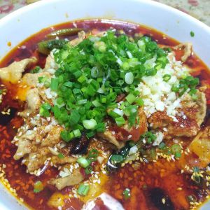 将锅内煮好的倒入准备好的菜碗中(盛油麦菜的)放上辣椒面,芝麻,蒜末,锅内放油烧热