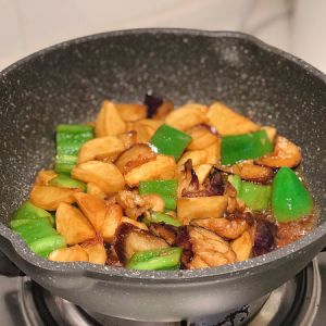 锅中留少量底油,加入蒜煸香,加入青椒过油捞出,倒入提前调好的料汁烧开至粘稠
