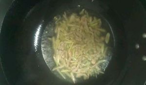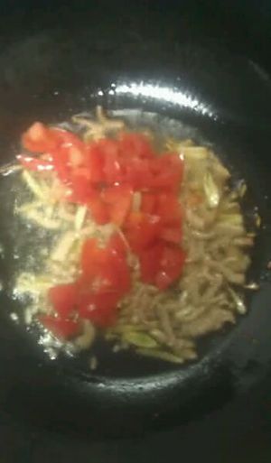 锅内倒油,油热后将切好的肉丝放入锅中,当肉丝变色后再将切好的葱姜蒜放入锅中入味儿。