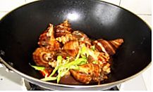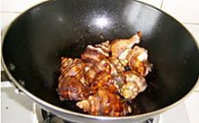 翻炒过程中淋少许料酒,待海螺的盖开始张开时,加入糖、鸡精翻炒,出锅前放入青红椒即可