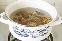 海螺用刷子清洗净,将其浸泡在加少许香油或食盐的凉水里2小时左右,让其吐净肠里的泥沙