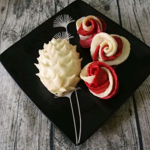 一排排剪出刺,刺的大小尽量均匀,用筷子沾水在头部左右扎一下,按上黑芝麻做眼晴。