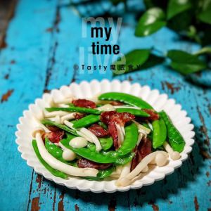 清新鲜香的腊肠炒荷兰豆海鲜菇就做好啦~荤素搭配 营养美味呦!