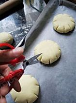 把面包胚放在烤盘上,轻轻压一下,用剪刀剪8个口。