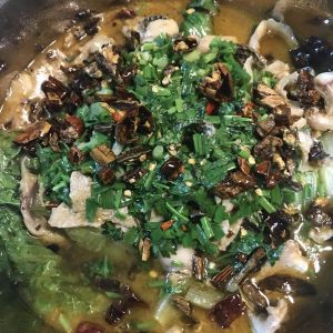 最后下鱼片,注意要一片一片下。注意时间把握。捞起后,放葱香菜干辣椒等,浇热油后搞定。