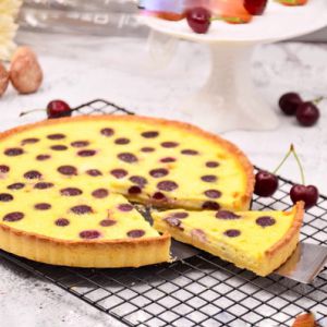 制作挞水:将淡奶油、牛奶和细糖搅拌至糖融化,再加入蛋黄搅拌均匀.