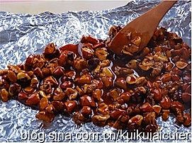 煮的过程中随时观察,沸腾后表面气泡会很多很大,但随着水分的减少气泡也会变少变小,待水的边缘呈现淡淡的黄色,把火力调到最小,这时可以晃动一下锅子,观察糖浆的颜色,变成琥珀色或棕褐色时、并闻到香甜的焦糖味,这时加入放凉的大杏仁、核桃仁和榛子仁碎,搅拌均匀后,倒在锡纸或不粘纸上,摊平成片状,放凉成牛轧糖备用。