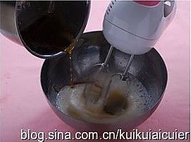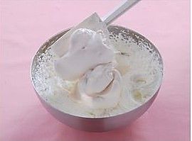 鲜奶油和糖混合,用打蛋器搅打,打至七分发泡,混合打发好的蛋清拌匀,模具垫油纸。