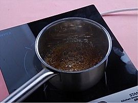 把砂糖100克放入小锅中,加入30ml水放入锅中,稍稍用勺子搅拌均匀,放到炉火上加热,加热时不要搅拌。