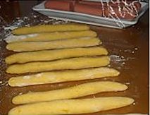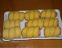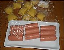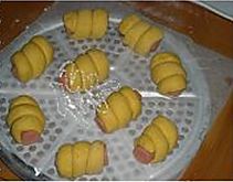 面团揉出空气,压扁,擀成长条,切开成20个小剂子,香肠切成段;