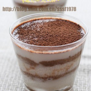 最后将玻璃杯放入冰箱冷藏,取出食用时筛上可可粉即可(没有可不加)。