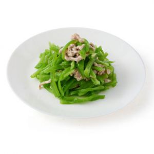 锅内加入油30克(约两汤匙)烧热,下青椒丝炒至断生,然后放入炒好的肉丝;