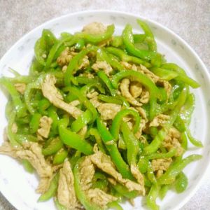 烧油,待油七八成热时,倒入腌制好的肉丝,再依次倒入青椒,加一点点盐,鸡精即可。