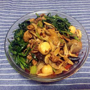 锅热倒少量油,放入鸡胗翻炒一分钟,加一茶匙老抽,小半碗水,继续炒两分钟。待用