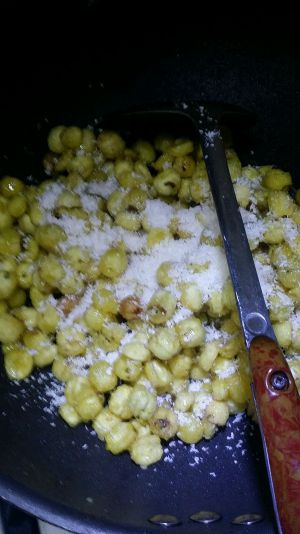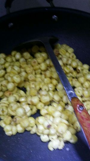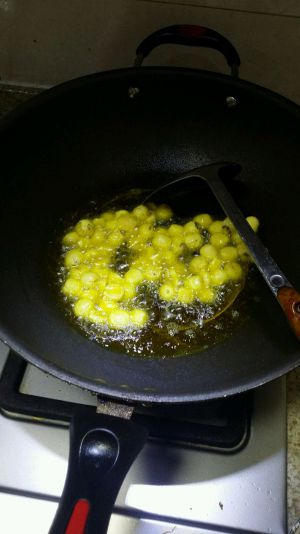 煮好后的莲子用冷水洗净,滤水后加玉米淀粉裹上薄薄一层。