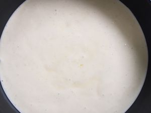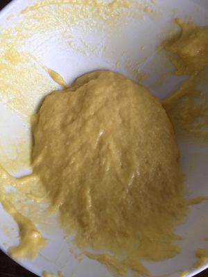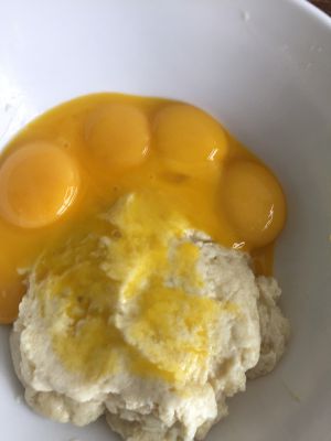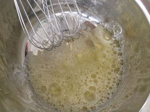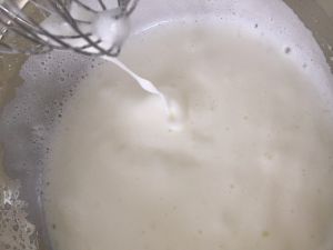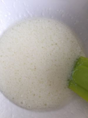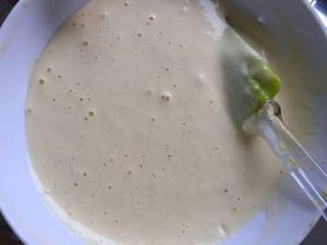 剩下的蛋液分两次加入,搅拌至微微发白,没有颜色那么深。